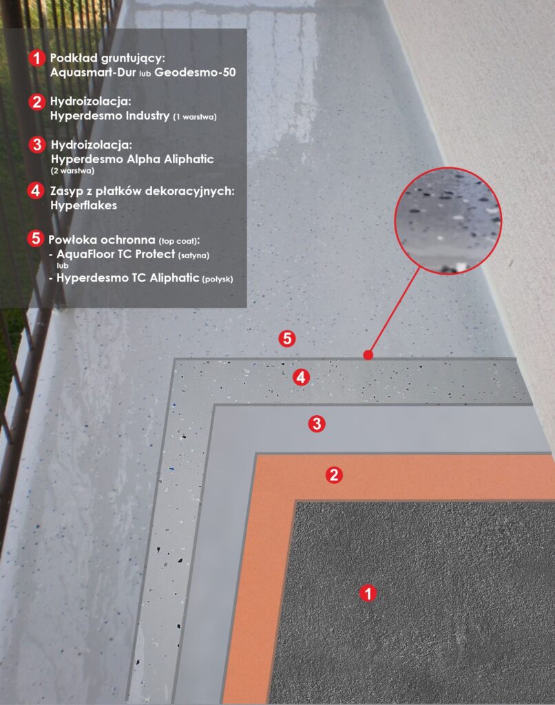 - Tarasy i balkony jako dekoracyjne wykończenie posadzki żywicznej – systemy płatków dekoracyjnych Hyperdesmo